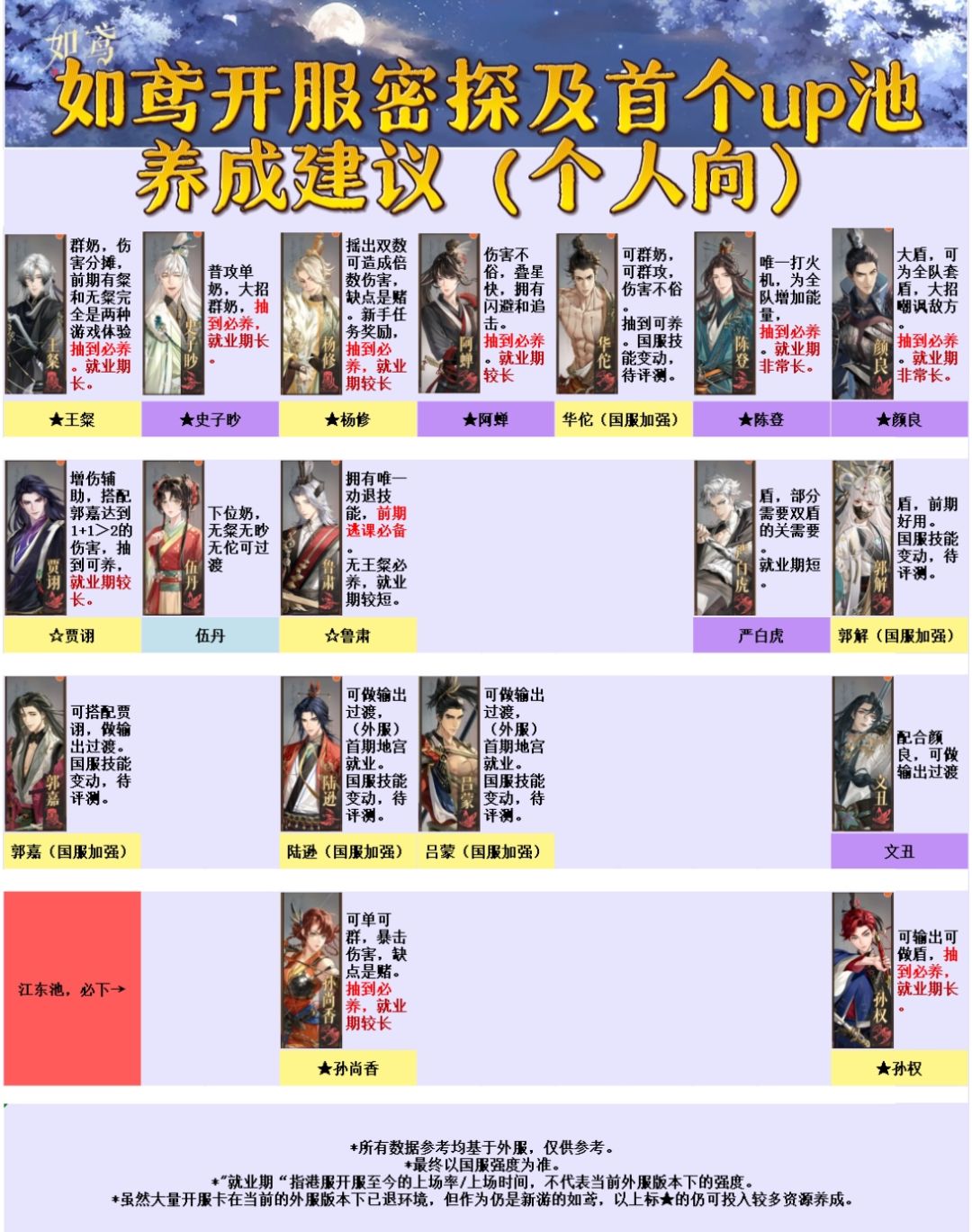 ⭕1号开始的江东限定池,都是当时T0的密探,如果担心数值改动,可先等评测后再下池。