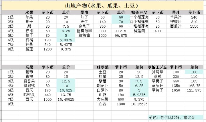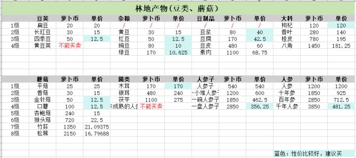 紫甘蓝、南瓜等高等级菜,萤火虫、独角仙等高级虫,高等级鱼(用量少 性价比低)