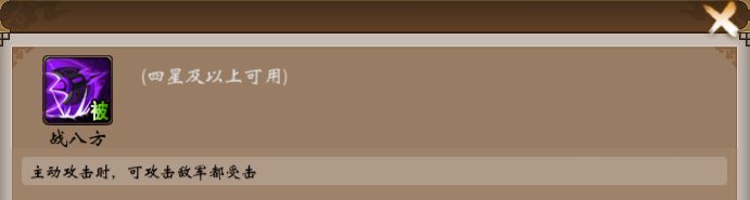 值得一说的是特别适配朱俊的四星皮肤技能:战八方,主动攻击时,可攻击敌军都受击。极大的提高了朱俊在群攻方面的伤害。