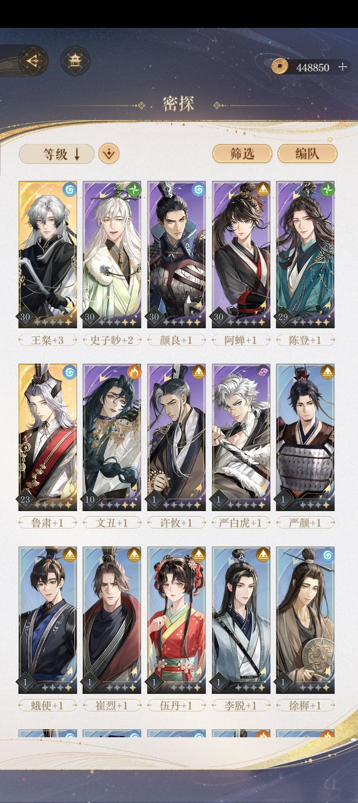 3.有些角色可以养有些角色是不可以养的(最普通的肯定是不能养的,除非你真的非得离谱,首先呢举个例子,紫的角色也有部分是不能养的(比如许攸之内),其它的如果说是正中你X P的话你适当养一些,(当然前提是你把主C什么全拉好)
