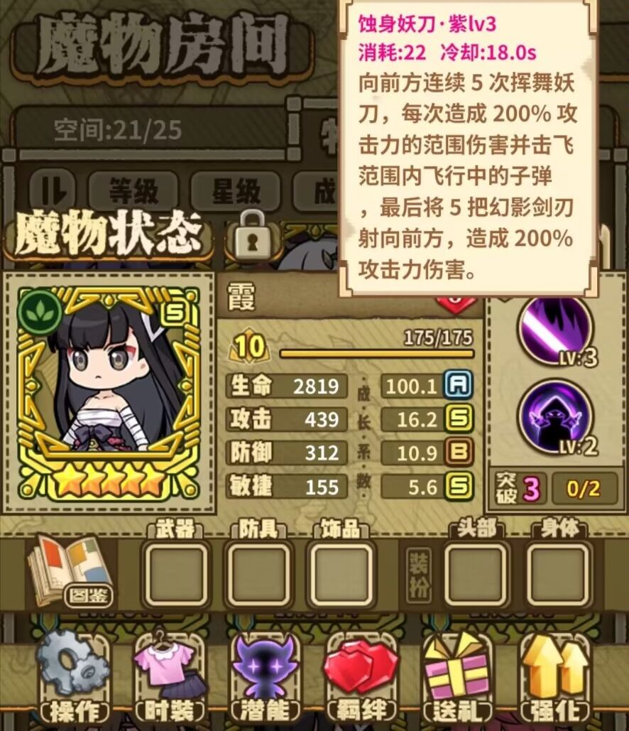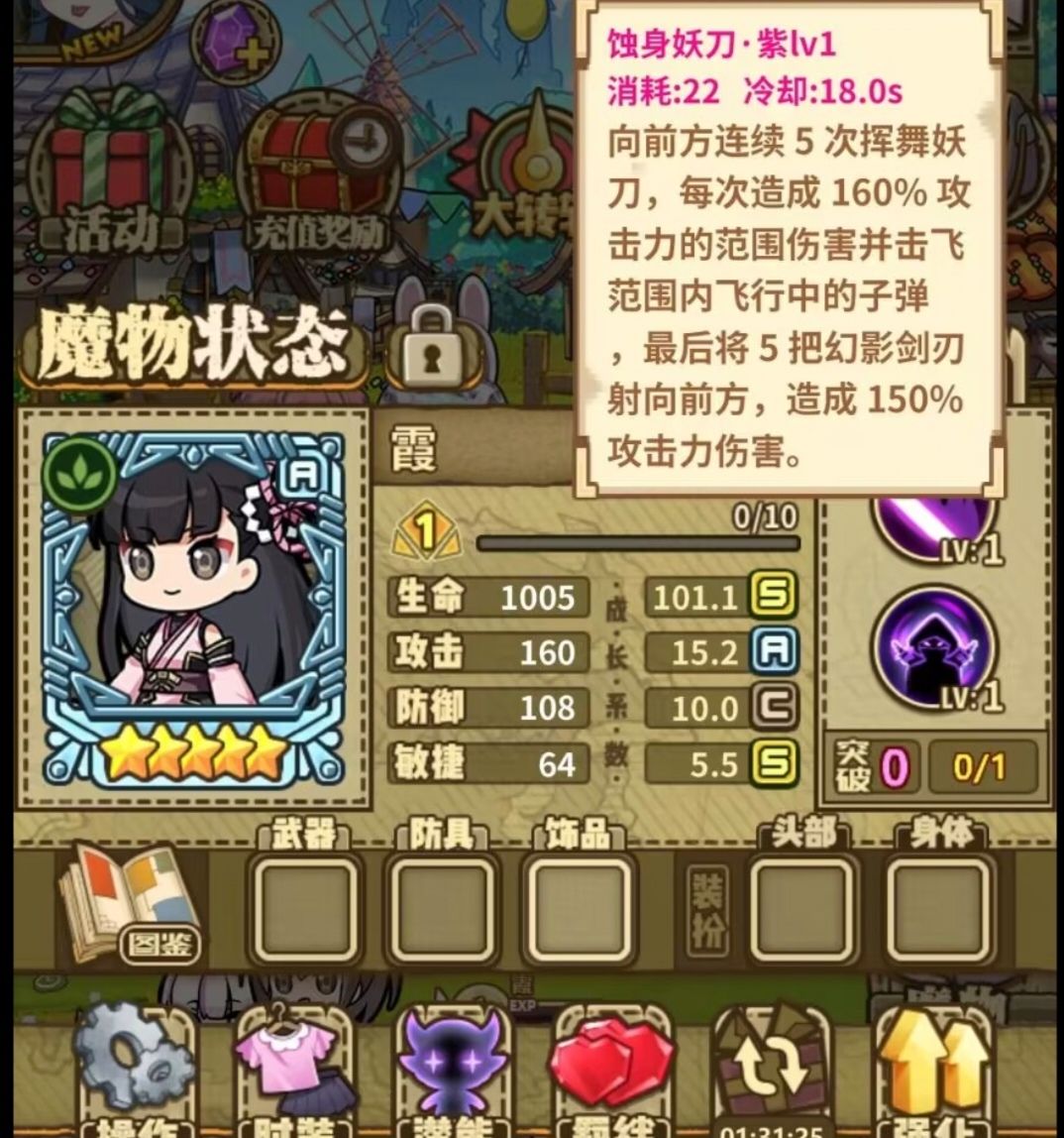 (1)几乎没有技能附带效果,生存能力堪忧。(其他魔物都有诸如免伤,减敌人攻速移速,真伤等,霞却只有一个没什么用的击飞子弹。)