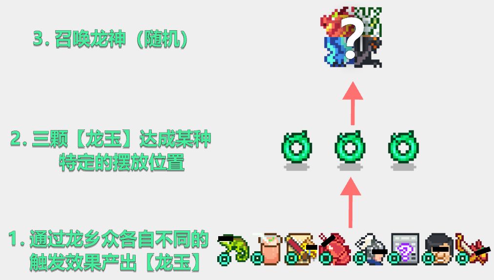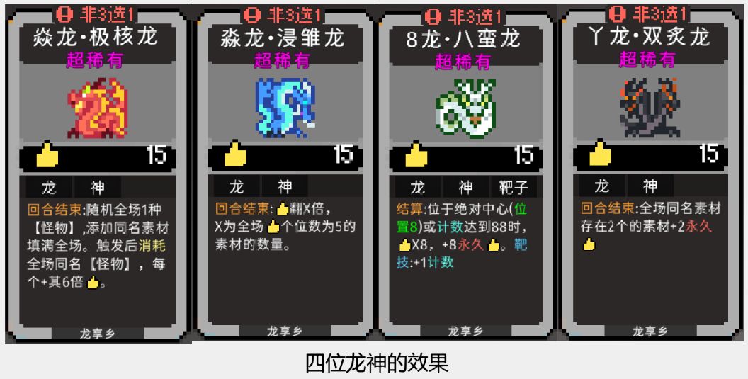 龙乡本质上是一个热爱龙的镇子,卡堆中会出现大量名字里包含龙(或读音为龙)的元素。游玩中需要完成龙乡众元素各自不同的触发条件,让他们产出【龙玉】并通过龙玉召唤效果强大的【龙神】,产出大量分数。目前一共有4位龙神。