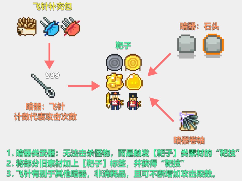现在,将部分卡片在原效果基础上赋予“靶技”。“靶技”可以被“暗器”类素材触发,每次触发执行一次“靶技”。比如:新卡《发条战士》效果会在计数达到6时(每回合+1计数)获得15赞。并拥有靶技:+1计数。那场上的暗器就可以使其自身效果更频繁的发动。