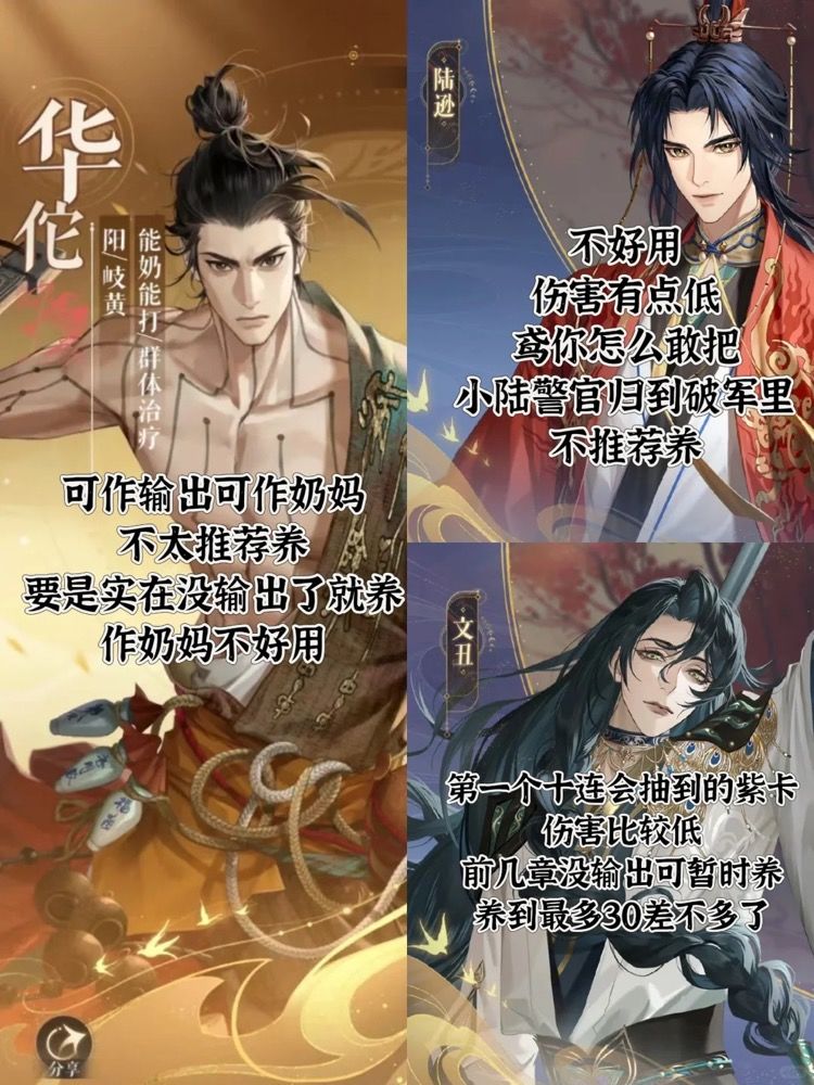 本篇包含了杨修、孙尚香、张仲景、王粲、华佗、陆逊、文丑七名密探,仔细写了攻略的都是比较推荐抽的密探。