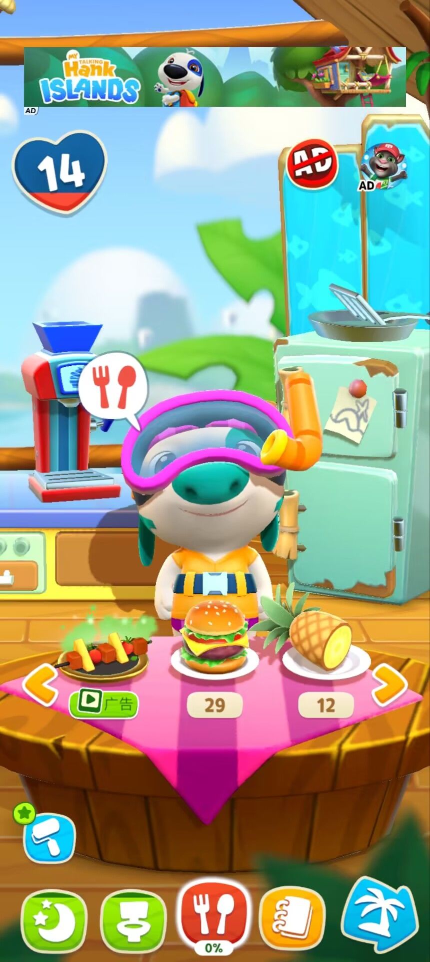 一起来认识汉克的家 汉克的家是一个舒适的树屋,卧室、浴室、厨房、门廊一应俱全。这里是汉克主要的活动场所。在树屋中,玩家可以满足汉克所有的需求并进行小游戏互动。