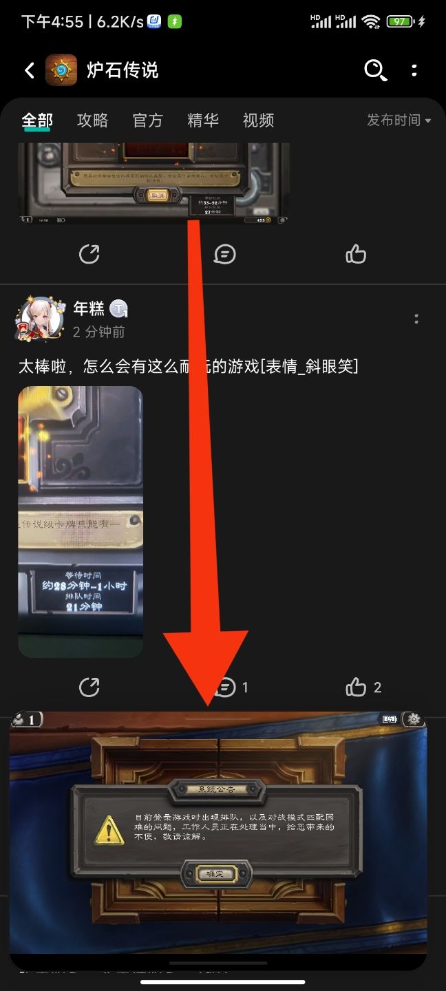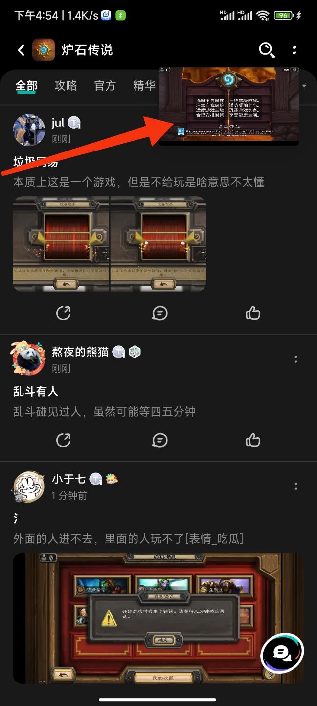 打开炉石(如图一)→上滑拖动到右上角“松手悬挂”处(如图二)→看其他应用的同时等待炉石开始(如图三)→觉得遮挡不方便可以往下拖动,系统公告直接确定即可进入游戏(如图四)