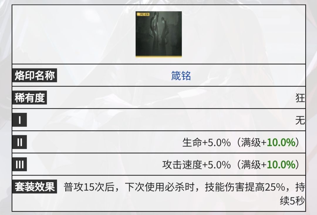 然后就是箴铭,蓝鹫自身攻速很快,稍微多获得一些攻速就能够非常容易达到箴铭的触发条件,而且必杀15点能耗,触发频率也很高,效果可以持续挺长时间。