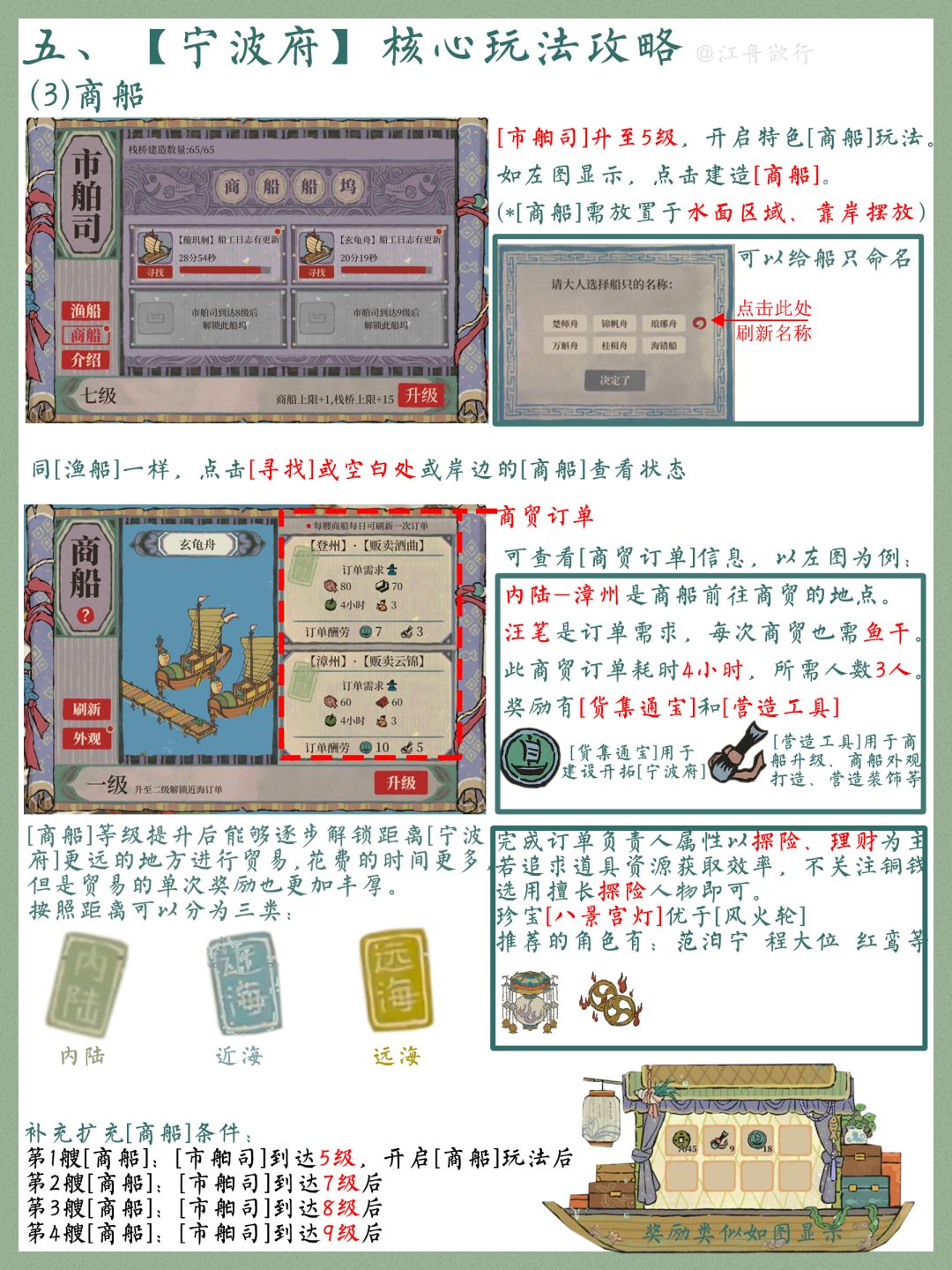 5.P4-P7为主要宁波府特色玩法攻略,还是比较简单的,跟着任务教程走就好。注意看好角色天赋是否满足条件,商船玩法不在意铜钱收入的话带探险高的人物就好了。外观玩法暂时没有加成,等后续跟进后确定。栈桥玩法可以理解为一种新的装饰,自带道路的属性,后续更多玩法敬请期待。