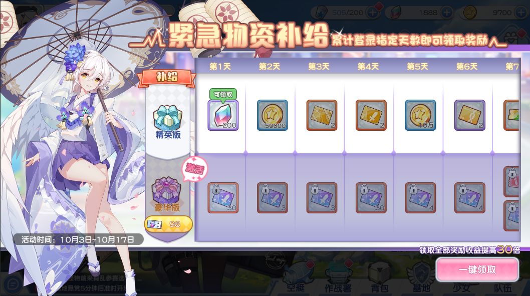 亲爱的指挥官,新一期登录补给活动即将来临,活动期间连续登录即可领取相应奖励,激活豪华补给更可额外获取稀有道具奖励~