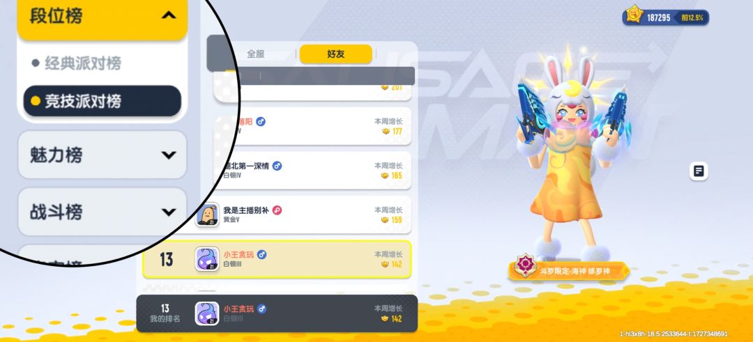 再看段位排行榜,竞技玩家也有自己的排名,竞技派对打的好的玩家终于也能和经典一样上榜了。