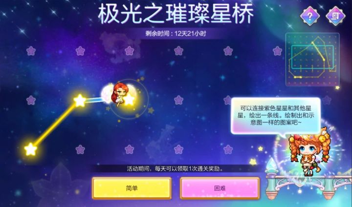 璀璨星桥活动开放了,活动比较简单,控制角色连接星星成“展示图”,选错星星会有眩晕惩罚,冒险岛特色小游戏环节。