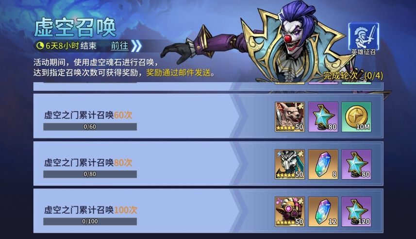 活动期间,使用虚空魂石进行召唤,达到指定召唤次数可获得:萨菲娅、卡塔淇拉、苏比拉、穆勒、湛蓝之星、星环宝石等奖励,奖励通过邮件发送。
