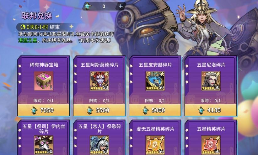 活动期间通过购买限时礼包或关卡掉落获得湛蓝之星,兑换以下稀有道具:稀有神器宝箱、虚无五星精英碎片、皮安赫、阿斯莫德、【祭司】伊内丝、尼洛、【恋人】祭歌等奖励。