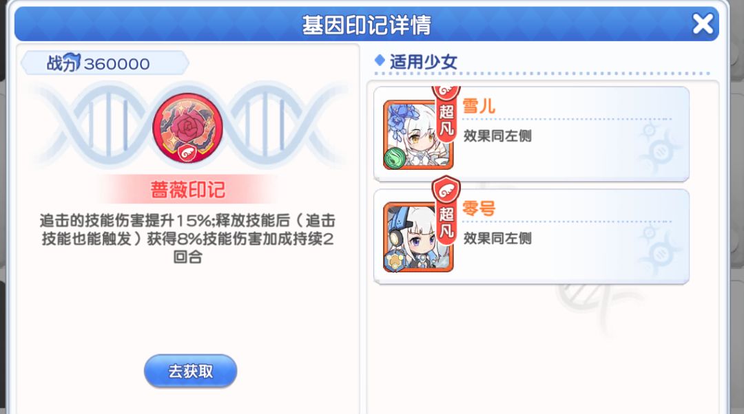 蔷薇印记:对雪儿和零号增幅十分不错因为每次追击都可以叠技能伤害,多动和多动的追击也叠并且持续两回合。推荐雪儿和零号练了几个抽几个。