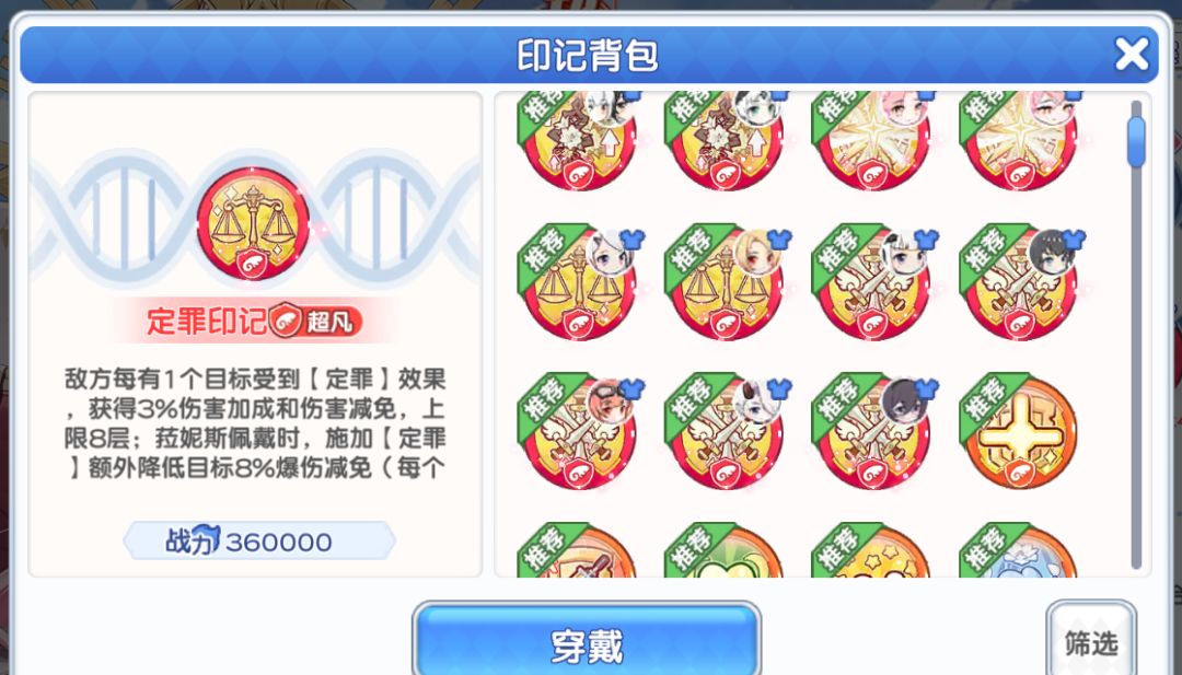 噬魂印记:群桩特化强力印记,击杀六个目标可以叠60技能伤害,再算追击和多动以及两回合,收益是及其恐怖的。推荐必备一个,也基本只需要一个(需要注意前期没法击杀目标的新手玩家噬魂用处暂时不大,所以慎重在箱子选取)。大后期有富裕可以抽取第二个给辅C使用收益不高。