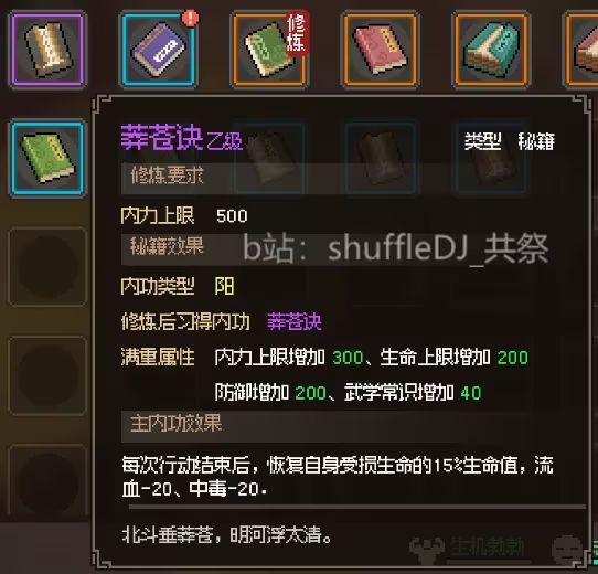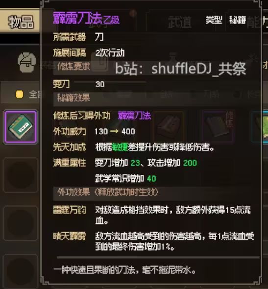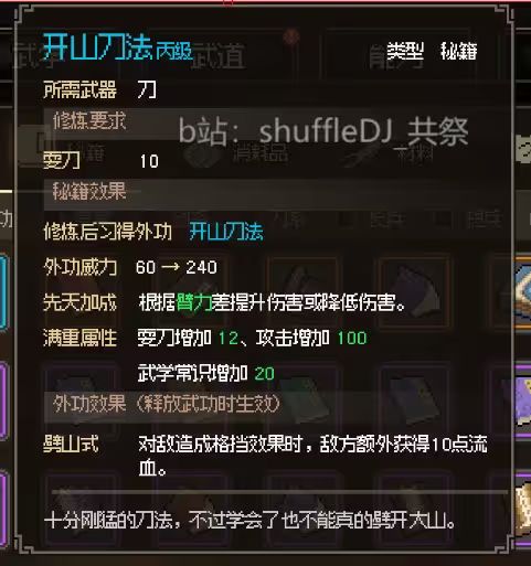 入队获得他的钥匙 在边上的宝箱开出耍刀心得+5刀法 8个紫药和5000块 给一本蓝色刀法