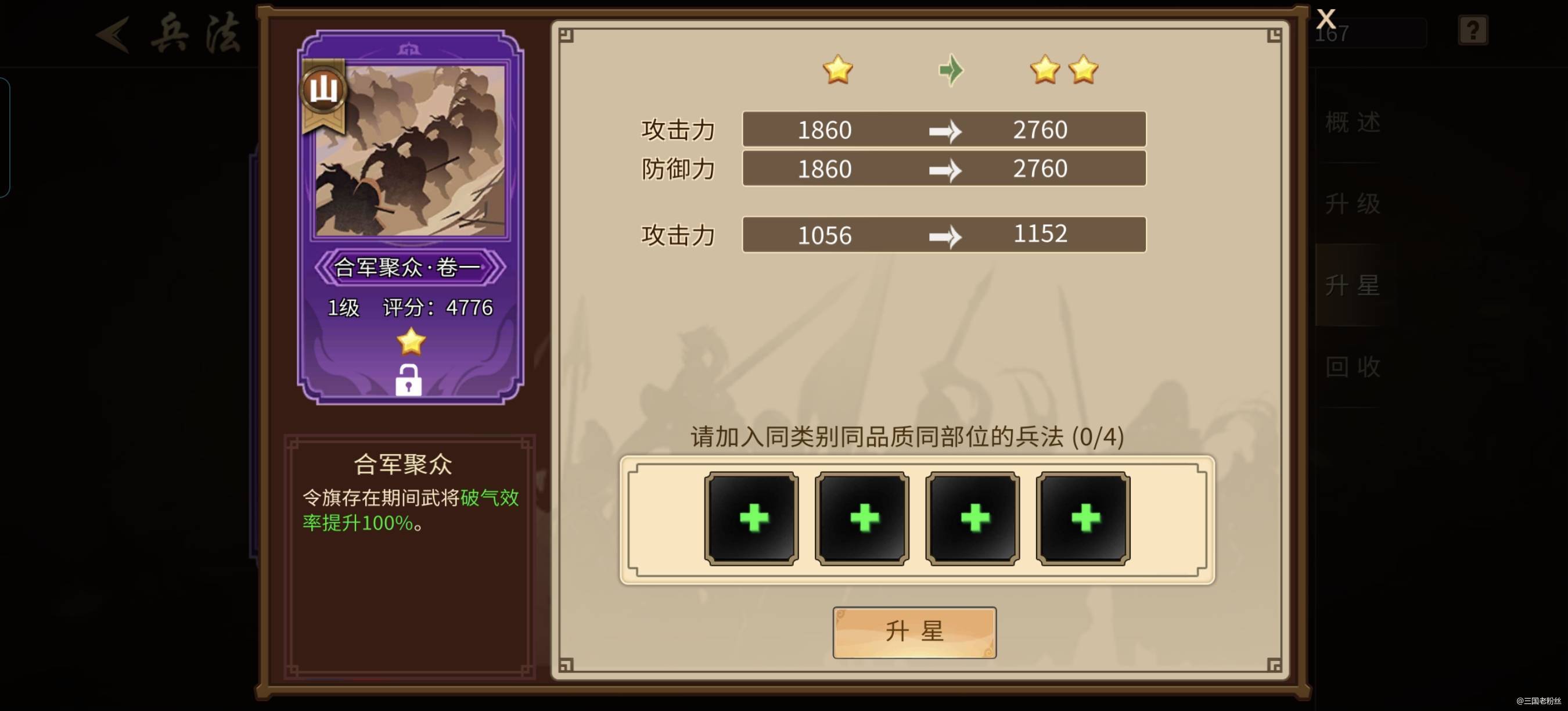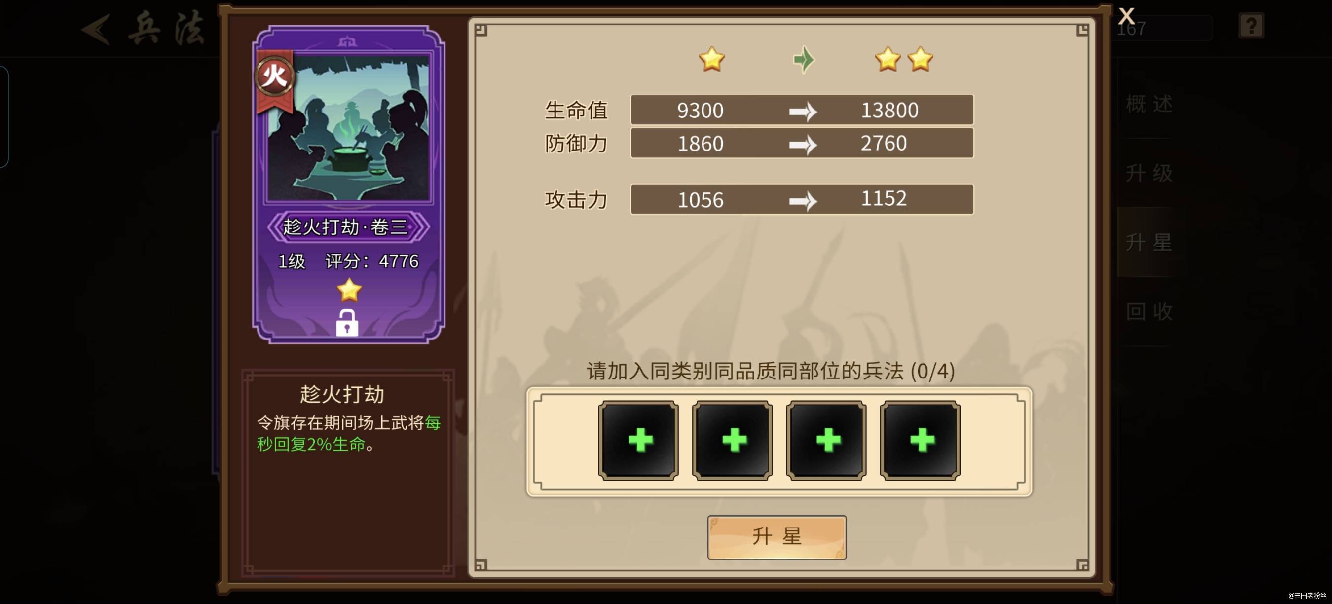 紫色升星多给援军比装橙色加战力和属性多,以及性价比高,而且还可以给主力加些许攻击力。