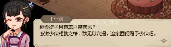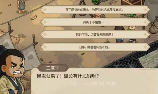 选要表示获得白玉碗(选了就没后面的了 不建议) 选2或1二麻子消失(之前如果对话过丁小姐会出一个告知他是沸羊羊的事实 这里才会有2 一定要注意 没有对话后面少个饰品)然后去找丁老爷 给10贯钱信用10 再去找丁小姐会给一个加鉴定的饰品