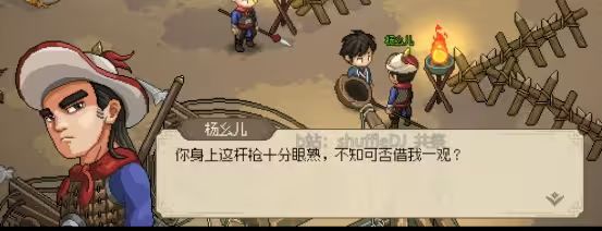 这里他会承认是杨家后人 选认同杨将军志向 好感直接拉到60 入队给杨家排位 具体用法是去小村的破庙 击碎案台拿梨花枪法 可以参看共祭的视频《一线培育计划之杨家后人杨幺儿》 https://www.bilibili.com/video/BV1k84y1p7Xs/
