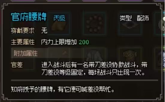 第一次接触时会有个差役叫你去拿10个狼牙 回来换个蓝色每天+100钱的蛤蟆(要装备在身上才有效果 队友也可以)名声10城关系5