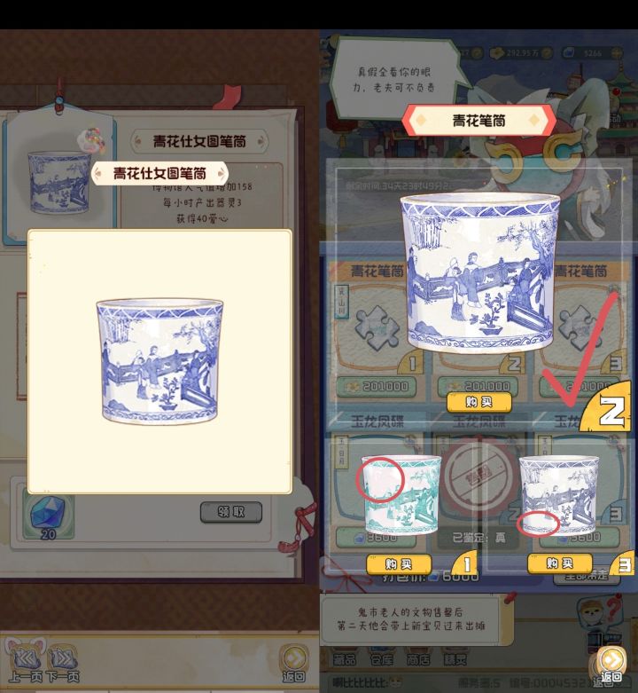 青花仕女图笔筒:颜色差异最明显,真品是亮一点的蓝色,左上角有竹林,左下角有山石,绿色左上角没有竹林,灰色左下角没有山石。