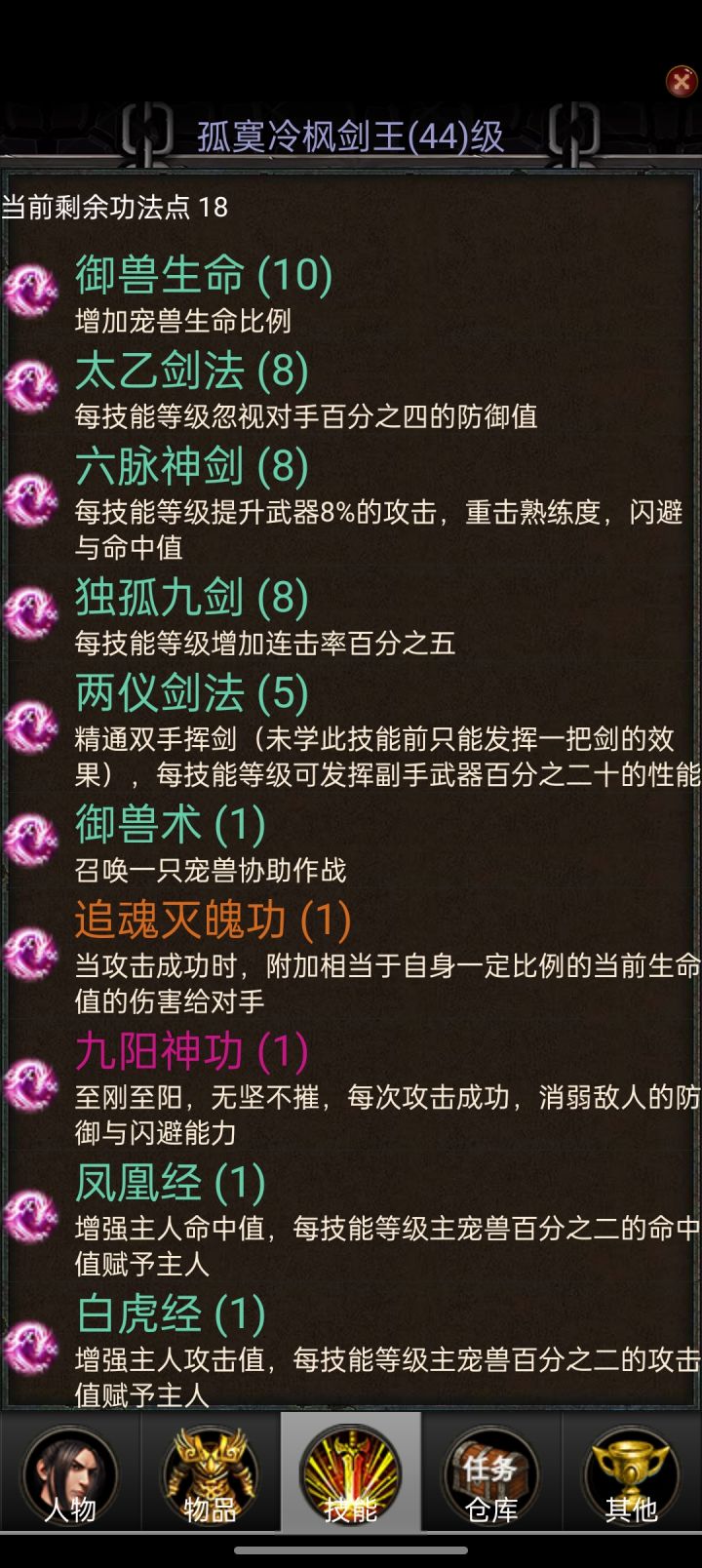 我玩的是器修,所以今天讲讲关于器修之路,首先我前40级全部加的命中,因为器修有连击,你想想怪物闪避还是回血的,宠物技能学生命就好了,有命可以多抗一会,然后学白虎经给人物加攻击,凤凰经给人物加命中,其他的多学没功法点啊,人物技能除了追魂灭魄功,其他学满