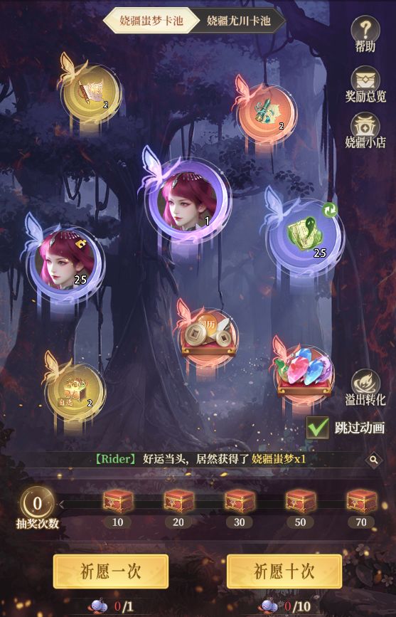 1、蝶引奇境活动期间,少侠可自选奖励填充入当前卡池,再消耗活动道具进行抽取,从卡池奖励中按权重随机获得奖励。卡池中存在资源奖励,抽取到资源奖励时,会在对应的资源池中按权重获得资源。