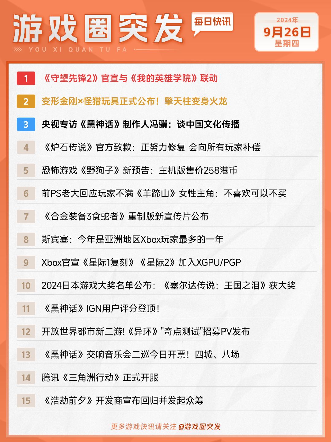 1️⃣《守望先锋2》官宣将与《我的英雄学院》联动 《守望先锋2》官宣,将在10月17日开启全新联动活动——联动《我的英雄学院》,持续两周,10月30日结束。 2️⃣变形金刚×怪猎玩具正式公布 《变形金刚》40周年×《怪物猎人》20周年联动产品正式发布,这是一款Liolaeus Prime玩具,怪猎元素加持的擎天柱可变形机器人和火龙形态。玩具将在2025年7月下旬上市,售价7150日元,今年9月27日开启预订。 3️⃣央视专访《黑神话》制作人冯骥 近期,国产游戏《黑神话:悟空》“圈粉”全球玩家。游戏破圈出海,央视专访《黑神话:悟空》冯骥。 4️⃣《炉石传说》官方致歉:正努力修复 会向所有玩家补偿 针对《炉石传说》国服回归至今发生的问题,游戏官方发布“关于当前《炉石传说》相关游戏问题的公告”,向玩家郑重道歉。官方在公告中表示将对玩家进行补偿,同时也对目前存在的一些误解做出解释。 5️⃣恐怖游戏《野狗子》新预告:主机版售价258港币 在今日的TGS 2024展会上,由初代《寂静岭》导演外山圭一郎携手Bokeh Game Studio打造的新恐怖游戏《野狗子》发布全新实机预告,外山圭一郎也出面进行了介绍。 6️⃣前PS老大回应玩家不满《羊蹄山》女性主角:不喜欢可以不买 在近日的PS发布会上,对马岛续作《羊蹄山之魂》正式公布,而这作迎来了一位女主角亚津(Atsu),有玩家表达对《羊蹄山》采用女性主角的不满,认为这个“建立在男性角色基础上的”游戏系列被女性夺走了。 而索尼PlayStaion前负责人Shawn Layden发推回应了这种不满的声音,他表示:“1、它是款游戏,一种娱乐产品。开发团队会去创作拥有他们理念的游戏故事。2、它是款游戏,如果你不喜欢它,可以不买它。实际上,为什么不自己制作你想要的游戏呢?” 7️⃣《合金装备3食蛇者》 重制版 新宣传片公布 在TGS2024的Xbox发布会上,《合金装备3重制版》发布全新宣传片,本作将在PS5/Xbox Series/PC平台推出,发售日暂未公开。 #守望先锋2 #我的英雄学院 #黑神话悟空 #炉石传说 #野狗子