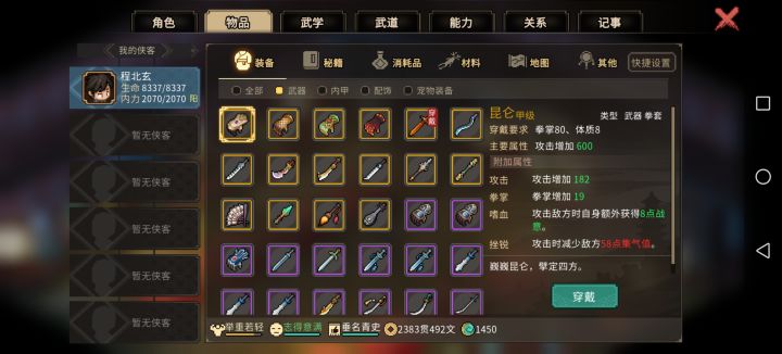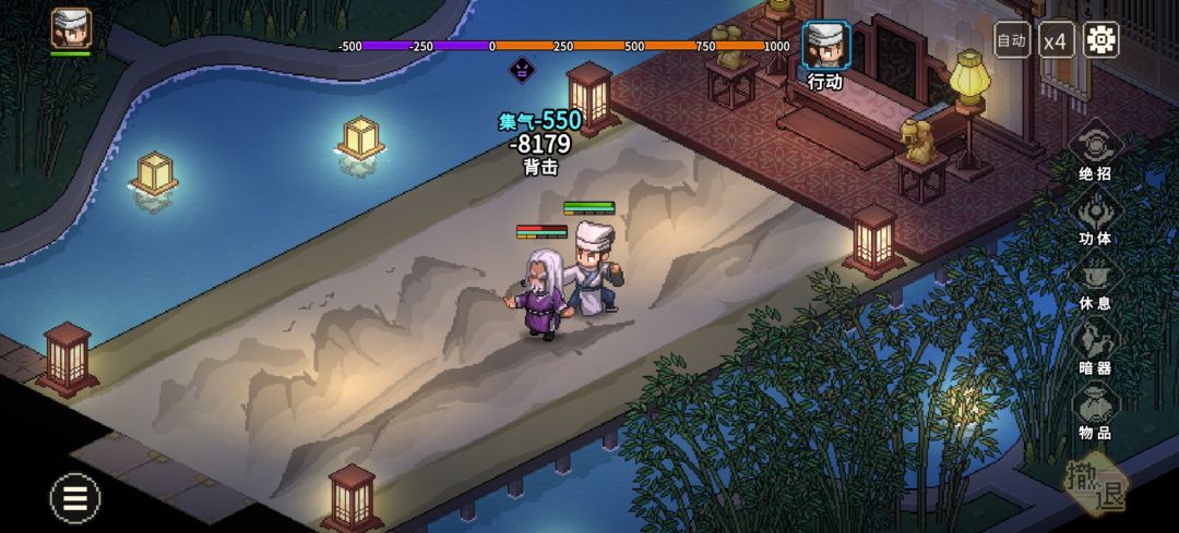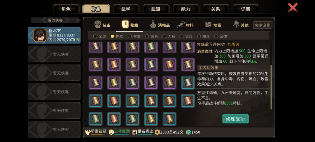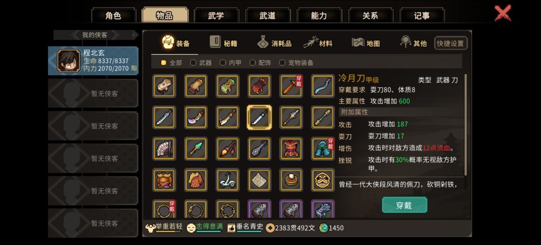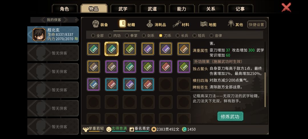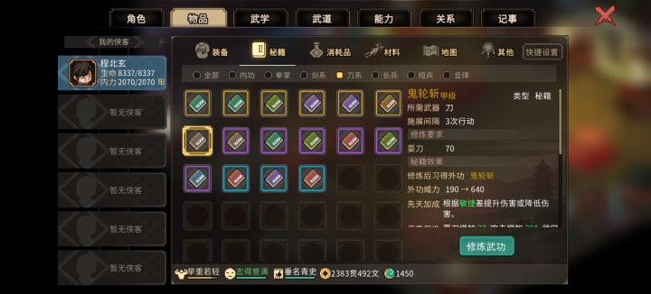 2.前期的橙色外功和橙色装备过渡问题,霖安城进门过一个完全躲不掉的宫本系列任务,最后他会告诉你去绝云崖,打完放他自杀给你一个鬼轮斩(图三),过锦阳关走龙脉宝藏的系列任务最后对话某个要死的靓女(名字忘了)可以免费拿到她的遗物冷月刀(图四),对属性不满意可以读档刷,最多20流血,配合鬼轮斩的效果很不错,这些基本上哪怕你玩得很菜,只要积极出村,都能在50天前拿到3.老头门师门任务后期开师门商店,卖的秘籍无双刀法(图五),配合昆吾一刀背刺能让对面大招清零外加行动值重新读条(图六),打掌门基本就是打木桩,家园悟道碑可以让这玩意和万民掌融合,不限武器,放二周目你想剑修儒修甚至琴修都能当定身术用,怕反弹?老头门任务后期送的九州诀(图七),每行动一次回一波血,对面弹你10次你回10次血,修罗也能无脑虐菜