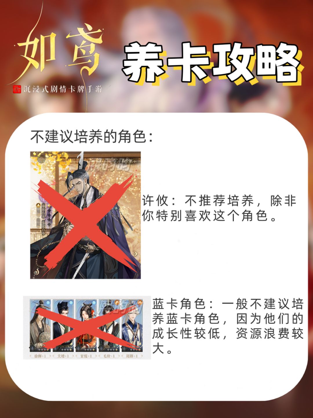 蓝卡角色:一般不建议培养蓝卡角色,因为他们的成长性较低,资源浪费较大。