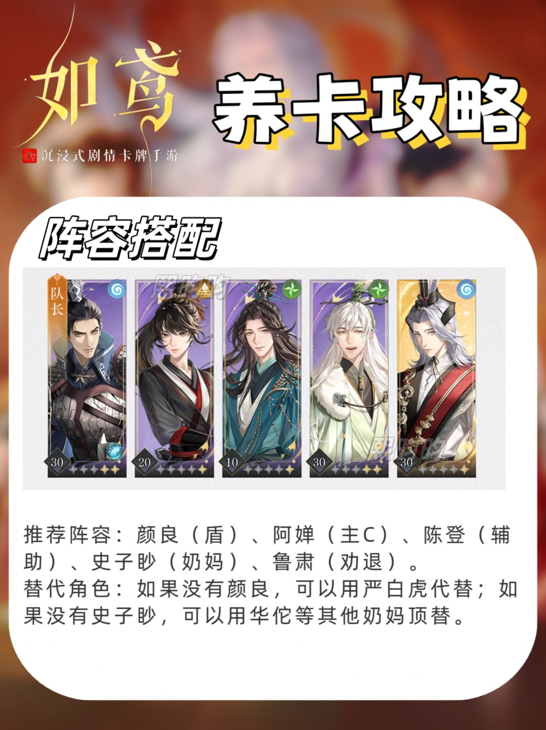 替代角色:如果没有颜良,可以用严白虎代替;如果没有史子眇,可以用华佗等其他奶妈顶替。