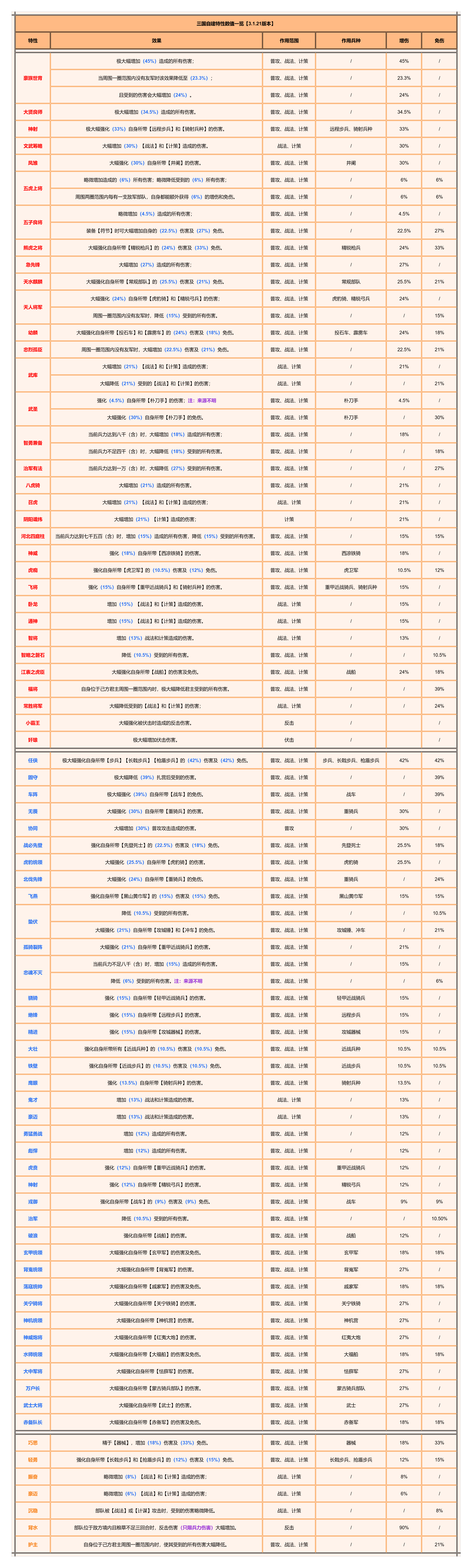 三国自建特性数值一览【3.1.21版本】