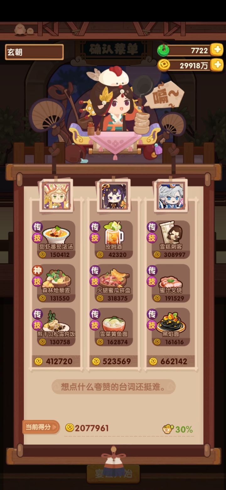 本次宴会很简单,只放俩无后厨菜和心法盘的单贵客作业。如果一个贵客分数不够,第二个随便凑满饱食度即可