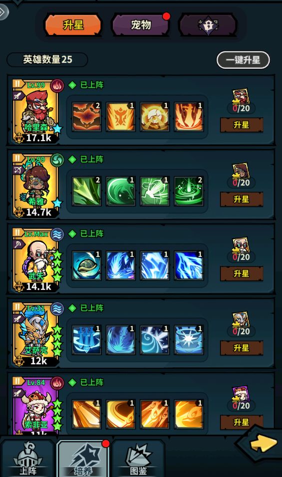 答:点击英雄-修改阵容-点击培养-点击英雄-查看英雄对应的属性、技能、装备、宠物和神器