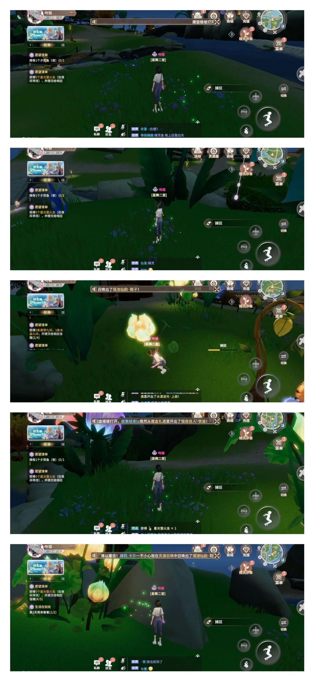 萤火虫需要再游戏内晚上的河边、树丛内可以找到