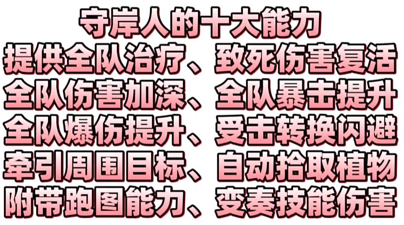 (1)作战特点:守岸人主要靠大招来提供辅助,可以为队伍中其他角色回血,还可提供暴击拐和爆伤拐。