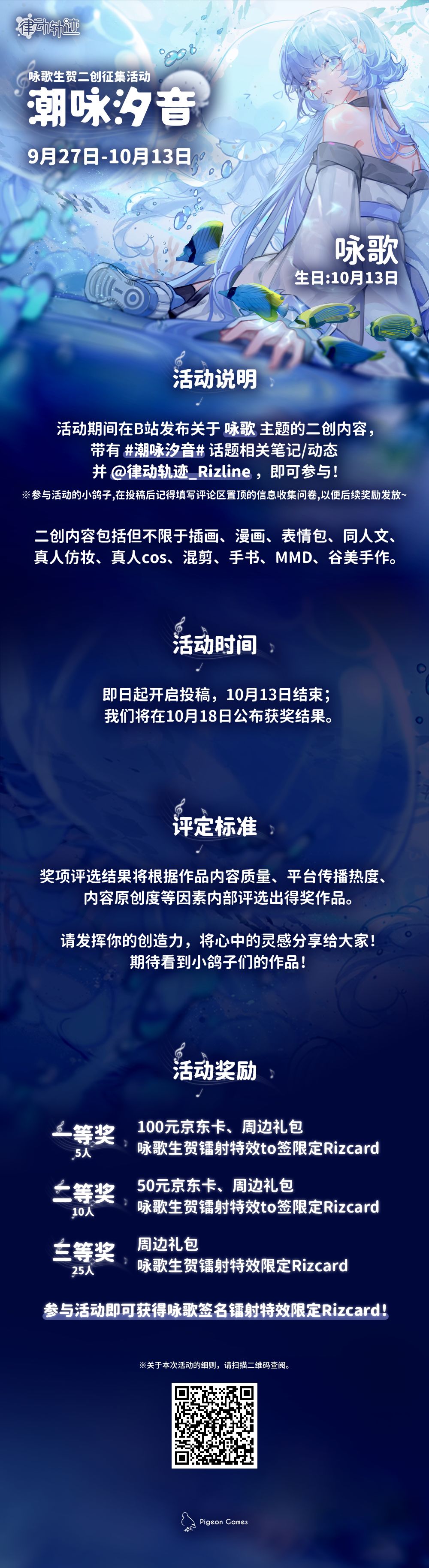 发布关于【咏歌】主题的二创内容,并填写评论区置顶的信息收集问卷,就有机会获取