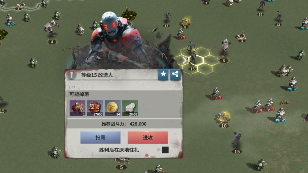 世界上游荡着不同等级的改造人,击杀改造人可获得资源及道具奖励,每个等级的改造人首次击杀有额外奖励,可搜索避难所附近指定等级改造人的位置。