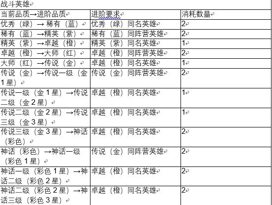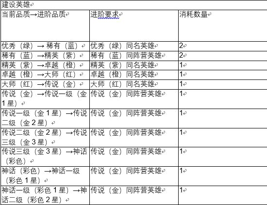 这些英雄进阶顺序如下:绿色—蓝色、蓝色—紫色、紫色—橙色、橙色—红色、红色—金色,