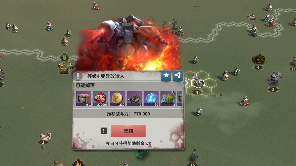 要留意车队耐久值,合理利用噢。每天都有5次集结攻打改造人的机会,攻击后可以获得大量的奖励和道具,是提升实力的重要手段之一。