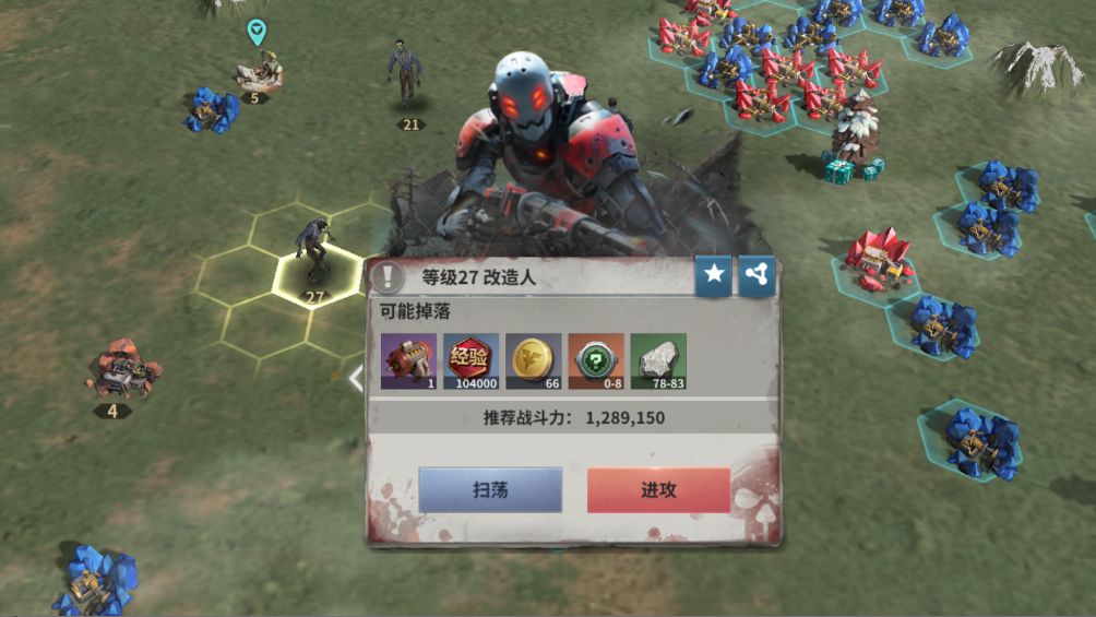 世界上游荡着不同等级的改造人,击杀改造人可获得资源及道具奖励,每个等级的改造人首次击杀有额外奖励,可搜索避难所附近指定等级改造人的位置。