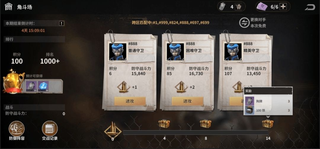 每日最多可领取3个进度宝箱奖励,奖励包含狗牌及资源,狗牌可在角斗场商店中兑换物品。