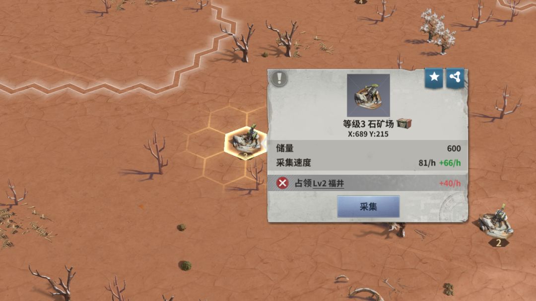 可通过采集快速获取资源,离线前可派遣进行采集。可通过搜索快速定位到想采集的资源矿点。