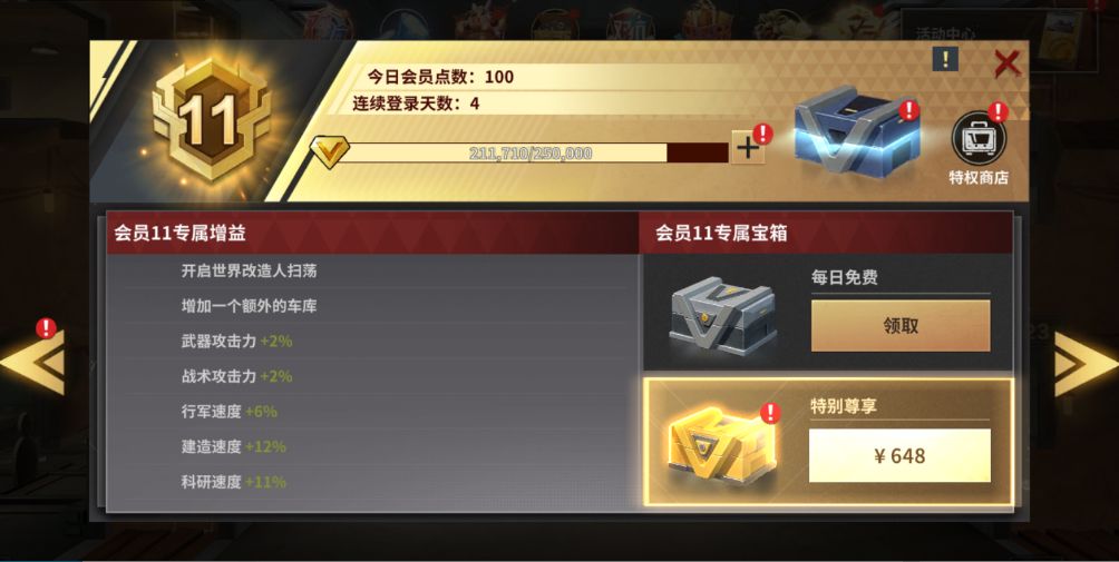 每日可领取VIP点数,连续登录天数越多,获得的VIP点数越多,上限100点。每日可领取VIP专属宝箱,随着VIP等级越高,每日可免费领取的奖励越丰富。
