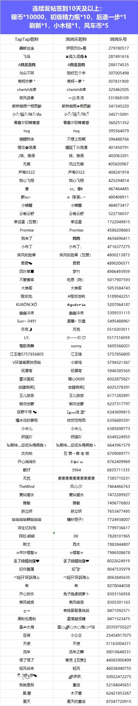 ■连续发帖签到10天及以上:银币*10000,初级精力瓶*10,后退一步*1,刷新*1,小木槌*1,风车币*5