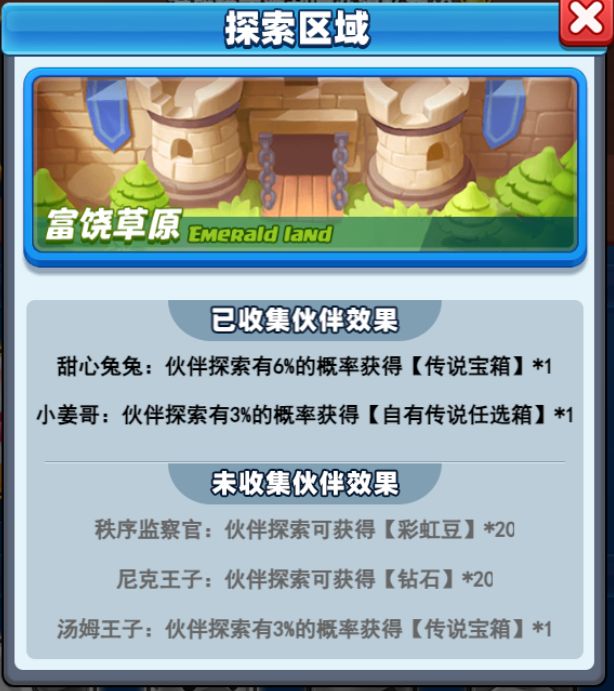 2、探索效果:伙伴上阵后会自动外出探索,每日24点将携带探索奖励回归,奖励内容包含区域探索奖励及伙伴专属探索奖励。