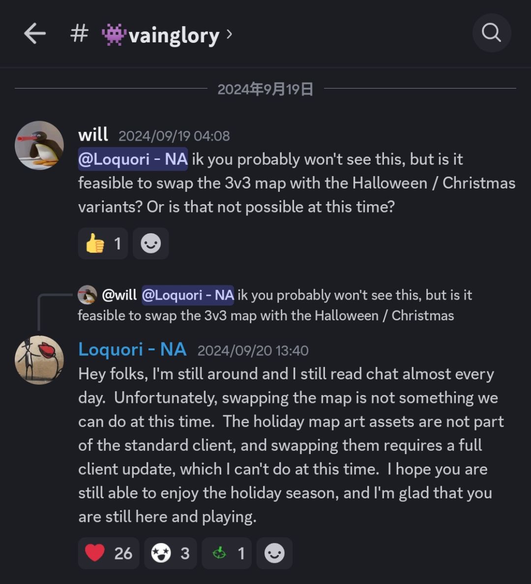 B站 Whiar的总结:根据开发者的回复,公司忙于别的游戏项目,虚荣仍然保持现在的状态;地图轮换需要更新客户端,目前负责虚荣维护的唯一一位SEMC员工表示没有时间(包括此前画的饼也还没有实装)