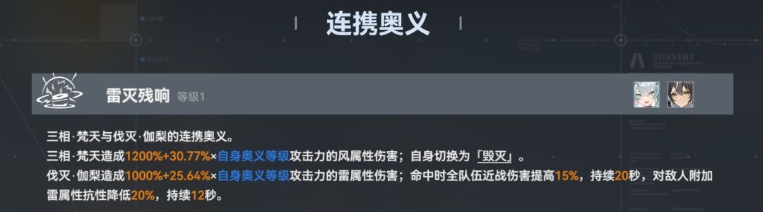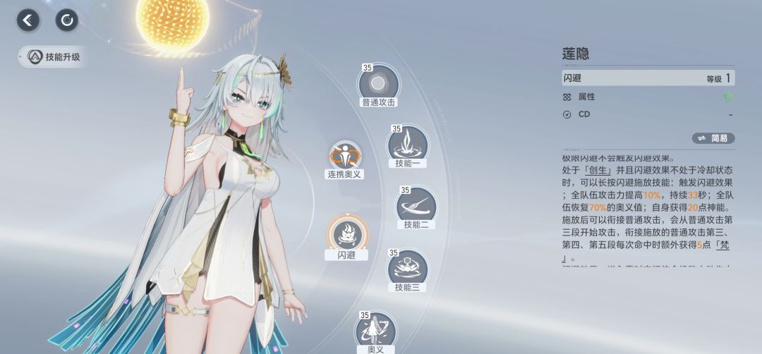 闪避:效果全队加攻击力,增加70%奥义值,零时空间2秒,普攻从第3段开始。