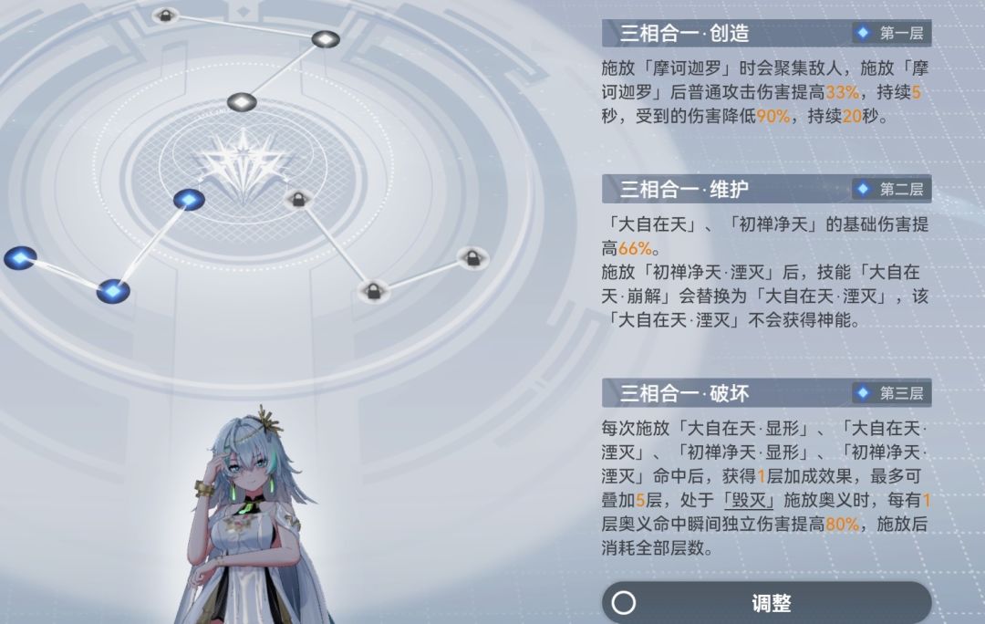 )还有一种中1左2神格,带夜宵近战刻印,长按闪避→a满梵(金色圆球)→11→33→奥义→a2技能a满机制条→11→33→1→a2a满机制条→11→33→1→重复a2a满三叉戟梵以后。就是按奥义后不再切换创生玩球形态,一直在这大形态输出