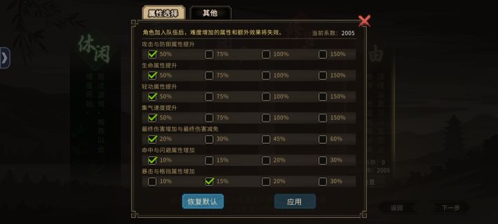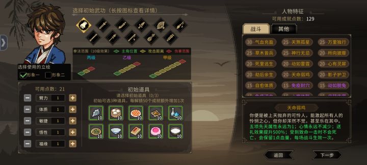 选扮猪吃虎,开局就是50级,有5个五维点可以加。五维任意一项到15是给成就的,所以这里就是刷这个。我到这里时有21点可加,反正一次够把两项加满的。